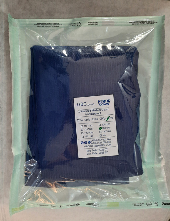 گان جراح استریل شده برند هرود ، 38گرم ، دارای مچ کشبافت ، استریل شده با گاز اتیل اکساید